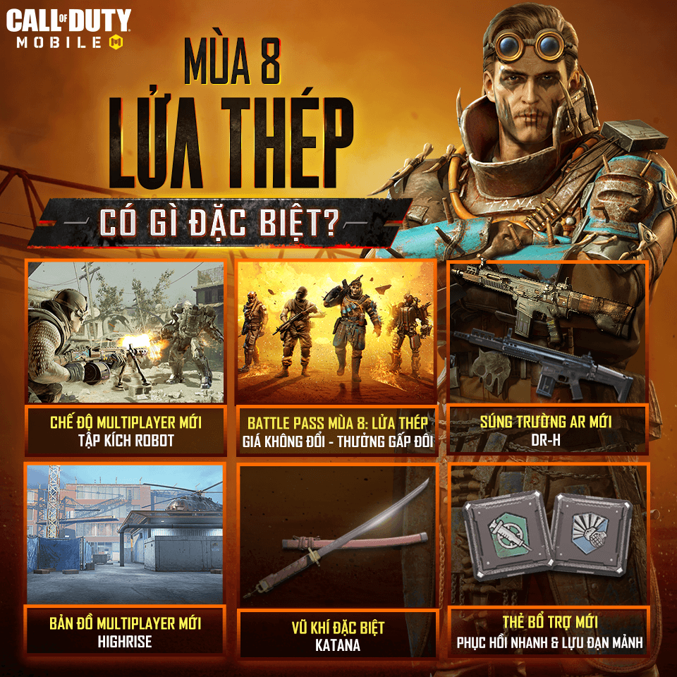 ✦ Call of Duty: Mobile VN mùa 8 "Lửa Thép": Hành trình kiến tạo thế giới từ đống tro tàn sẽ xuất hiện các nhân vật hoàn toàn mới: Tank Dempsey-Wrecker, Reaper-Grinder và nhân vật từ Modern Warfare: Kreuger-Reaper. Các Chiến Binh CODM phải sát cánh cùng nhau để đánh bại Juggernaut trong chế độ chơi MP mới. Ra mắt tiếp một bản đồ được yêu thích trong cộng đồng Call of Duty: Mobile VN - bản đồ Highrise.